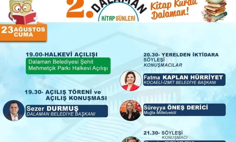 İzmit Belediye Başkanı Fatma Kaplan Hürriyet, Dalaman Belediyesi’nin ev sahipliğinde bu yıl ikincisi düzenlenen Kitap Günleri’ne katılacak. Başkan Hürriyet, 23 Ağustos Cuma günü saat 20.30’da gerçekleştirilecek “Yerelden İktidara” başlıklı söyleşide konuşmacı olarak yer alacak. Etkinlikte, Başkan Hürriyet’in yanı sıra Gazeteci Deniz Zeyrek ve CHP Muğla Milletvekili Süreyya Öneş Derici de konuşmacılar arasında olacak.