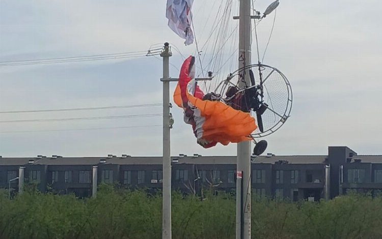 Sürücüsünün hakimiyetini kaybettği planör, elektrik tellerine takılarak asılı kaldı.