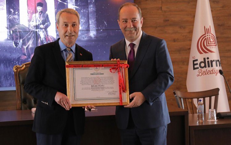 Edirne Belediye Başkanı Recep Gürkan, kendi imkânlarıyla yıllardır Edirne’yi tanıtan Tarihi Ciğerci Bahri Bey, Bahri Dinar’a belediye meclisinde tüm partilerin oy birliği aldığı kararla Edirne Turizm Elçisi olarak paye verdiklerini anımsatarak, kendisine belgeyi takdim etti.