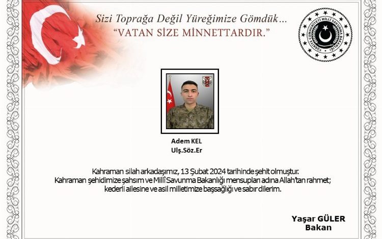 Bakanlık, sözleşmeli er Adem Kel için taziye mesajı yayımladı.