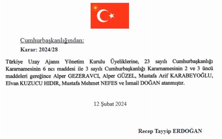 Bugünkü Resmi Gazete’de Cumhurbaşanı Erdoğan’ın imzasıyla yayımlanan atama kararları kapsamında Türkiye Uzay Ajansı Yönetim Kurulu üyeliğine 6 yeni isim atandı.