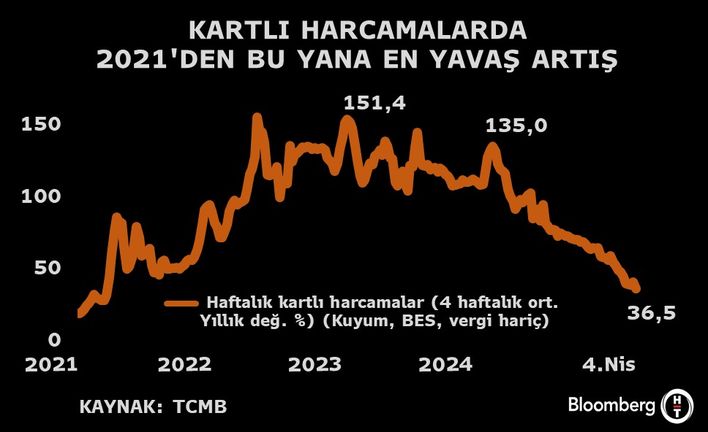 Bloomberg HT’nin Türkiye Cumhuriyet Merkez Bankası (TCMB) dataları üzerinden yaptığı hesaplamaya nazaran kartlı harcamalarda 4 haftalık ortalamanın yıllık değişimi 4 Nisan haftasında yüzde 36,5 olarak kaydedildi.