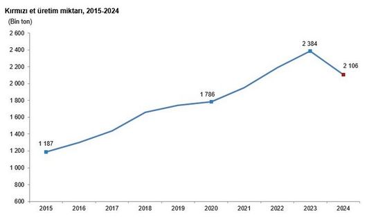 TÜİK bilgilerine nazaran, son on yıla ait kırmızı et üretim varsayımları incelendiğinde, toplam kırmızı et üretiminin 2015 yılında 1 milyon 187 bin 18 ton iken 2024 yılında 2 milyon 105 bin 895 ton olarak gerçekleştiği görülüyor.