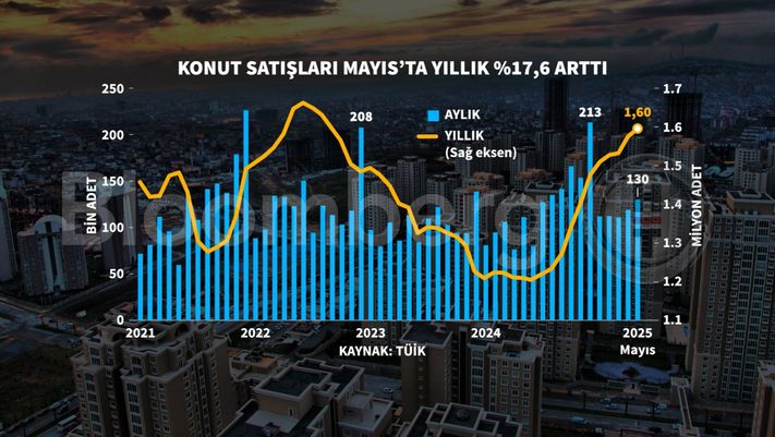 Türkiye genelinde konut satışları Mayıs ayında bir evvelki yılın birebir ayına nazaran yüzde 17,6 oranında artarak 130 bin 25 oldu. Konut satış sayısının en fazla olduğu vilayetler sırasıyla 22 bin 103 ile İstanbul, 11 bin 975 ile Ankara ve 7 bin 817 ile İzmir olurken, en az olduğu vilayetler sırasıyla 48 ile Ardahan, 67 ile Bayburt ve 91 ile Gümüşhane olarak gerçekleşti.