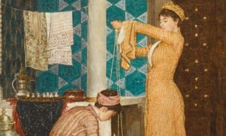Topkapı Sarayı’nın harem kısmı tasvir edilen tabloda, kahve hazırlayan iki genç bayan betimleniyor.