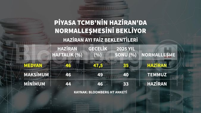 Ankete katılan 22 kurum katılırken Haziran ayında en düşük haftalık repo faizi iddiası yüzde 44 düzeyinde olurken, en yüksek beklenti yüzde 46 oldu.