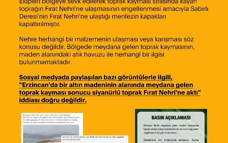 Sosyal medyada paylaşılan iddiaya ilişkin konu görüntülerin Fırat Nehri ya da herhangi bir baraja değil, Erzincan’ın İliç ilçesinde bulunan altın madeninin atık havuzuna ait olduğunu kaydeden İletişim Başkanlığı, paylaşımında, “Ayrıca toprak kaymasının hemen ardından Çevre, Şehircilik ve İklim Değişikliği Bakanlığı merkez ve İl Müdürlüğü Denetim Ekipleri bölgeye sevk edilerek toprak kayması sırasında kayan toprağın Fırat Nehri’ne ulaşmasının engellenmesi amacıyla Sabırlı Deresi’nin Fırat Nehri’ne ulaştığı menfezin kapakları kapattırılmıştır. Nehre herhangi bir malzemenin ulaşması veya karışması söz konusu değildir. Bölgede meydana gelen toprak kaymasının, maden alanındaki atık havuzu ile herhangi bir ilgisi bulunmamaktadır” ifadelerini kullandı.