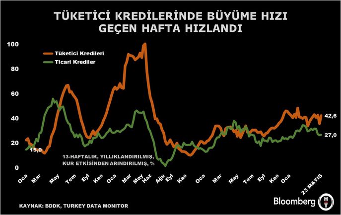 Tüketici kredilerindeki büyüme suratı ise evvelki haftaya hızlanma gösterdi. 16 Mayıs haftasında yüzde 36 olarak izlenen kredi büyümesi, 23 Mayıs haftasında yaklaşık 6 puan artarak yüzde 42,6 düzeyine çıktı.