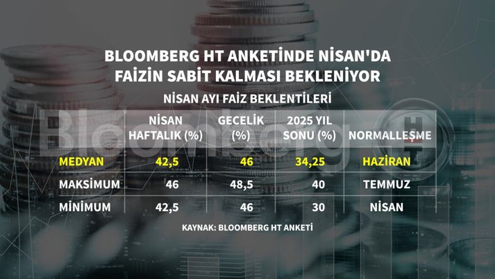 Bloomberg HT anketine katılan ekonomistlerin medyan beklentisi, Para Siyaseti Kurulu’nun (PPK) yüzde 42,50 düzeyindeki siyaset faizinde değişikliğe gitmeyeceği tarafında.