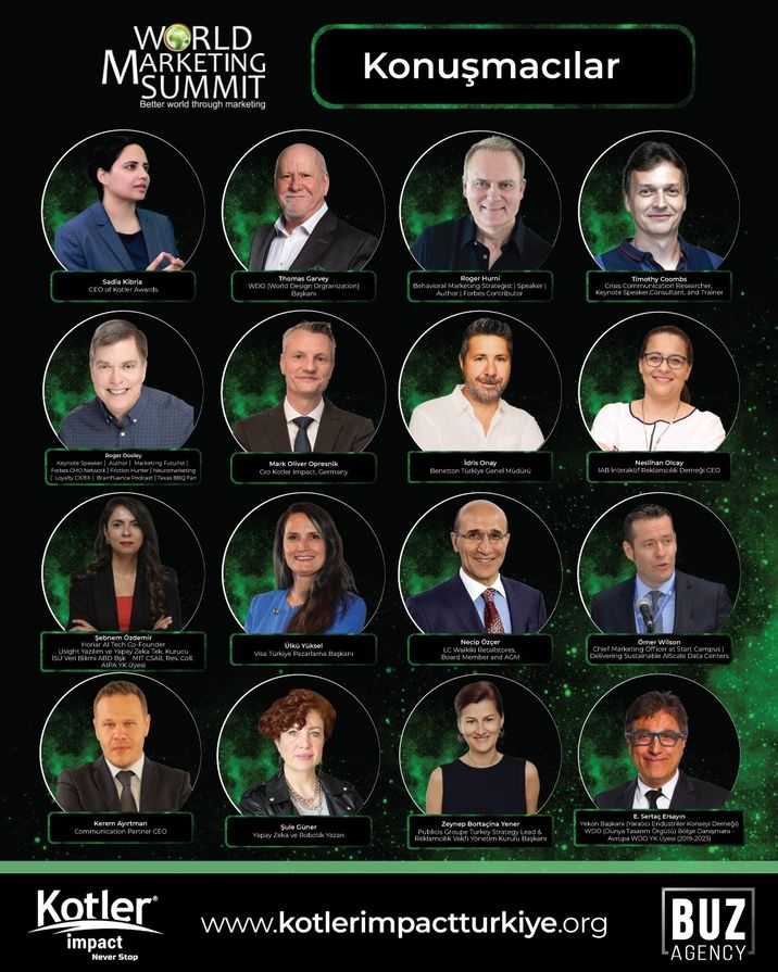 Habertürk, Bloomberg HT, Show TV ve HT Spor’un ana medya sponsoru olduğu World Marketing Summit Doruğu konuşmacıları ortasında Davranışsal Pazarlama Stratejisti ve Marka Uzmanı Mr. Roger Hurni, World Design Organization Başkanı Mr. Thomas Garvey, Nöropazarlama Stratejisti ve Pazarlama Fütürüsti Mr. Roger Dooley, Kriz ve Risk İrtibatı Danışmanı Mr. Timothy Coombs, Sürdürülebilir Pazarlama İdaresi Danışmanı Prof. Dr. Marc Oliver Oprensik üzere kıymetli isimler yer alarak, bilgi ve deneyimlerini konuklarla paylaşacak.