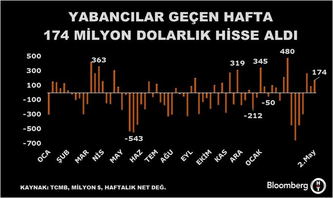 Türkiye Cumhuriyet Merkez Bankası (TCMB) tarafından açıklanan datalara nazaran, yurt dışında yerleşik şahıslar piyasa fiyatı ve kur hareketlerinden arındırılmış bilgilerle 2 Mayıs haftasında 173,6 milyon milyon dolar net pay alışı yaptı.