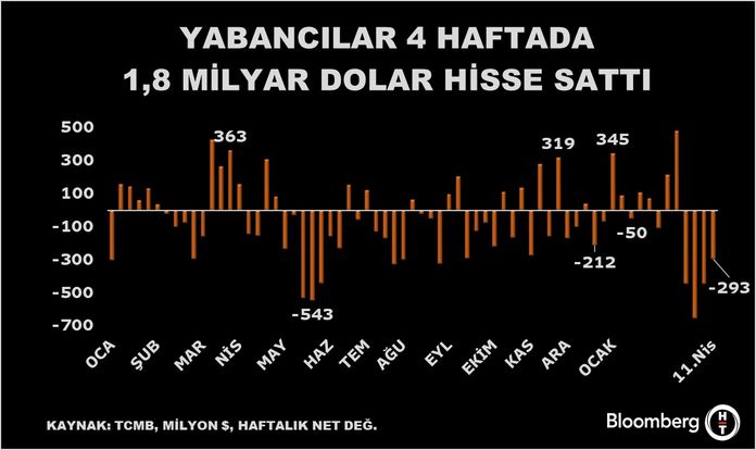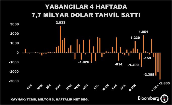 Türkiye Cumhuriyet Merkez Bankası’nın (TCMB) datalarına nazaran yabancı yatırımcılar 11 Nisan haftasında pay ve tahvillerde 3,1 milyar dolarlık net satış yaptılar.
