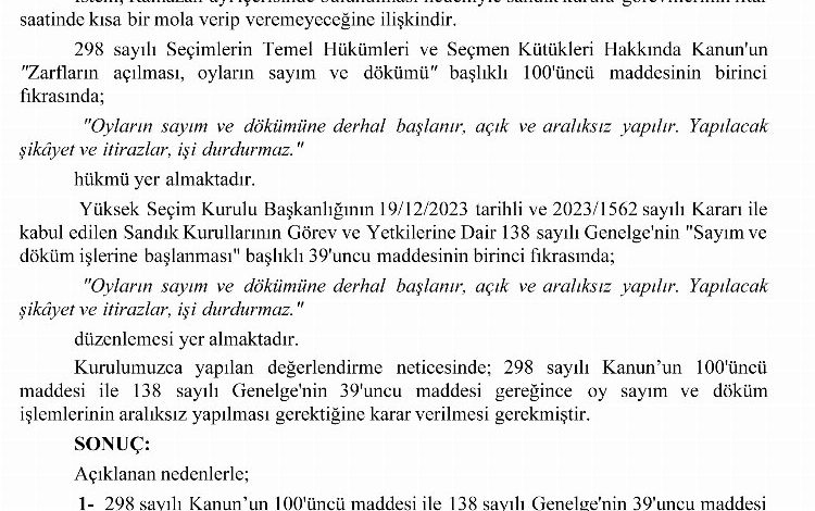 Konuyu inceleyen YSK, 298 Sayılı Seçimlerin Temel Hükümleri ve Seçmen Kütükleri Hakkında Kanun’un “Zarfların açılması, oyların sayım ve dökümü” başlıklı 100. maddesinin birinci fıkrasında, ‘Oyların sayım ve dökümüne derhal başlanır, açık ve aralıksız yapılır’ hükmü bulunduğu hatırlatıldı.